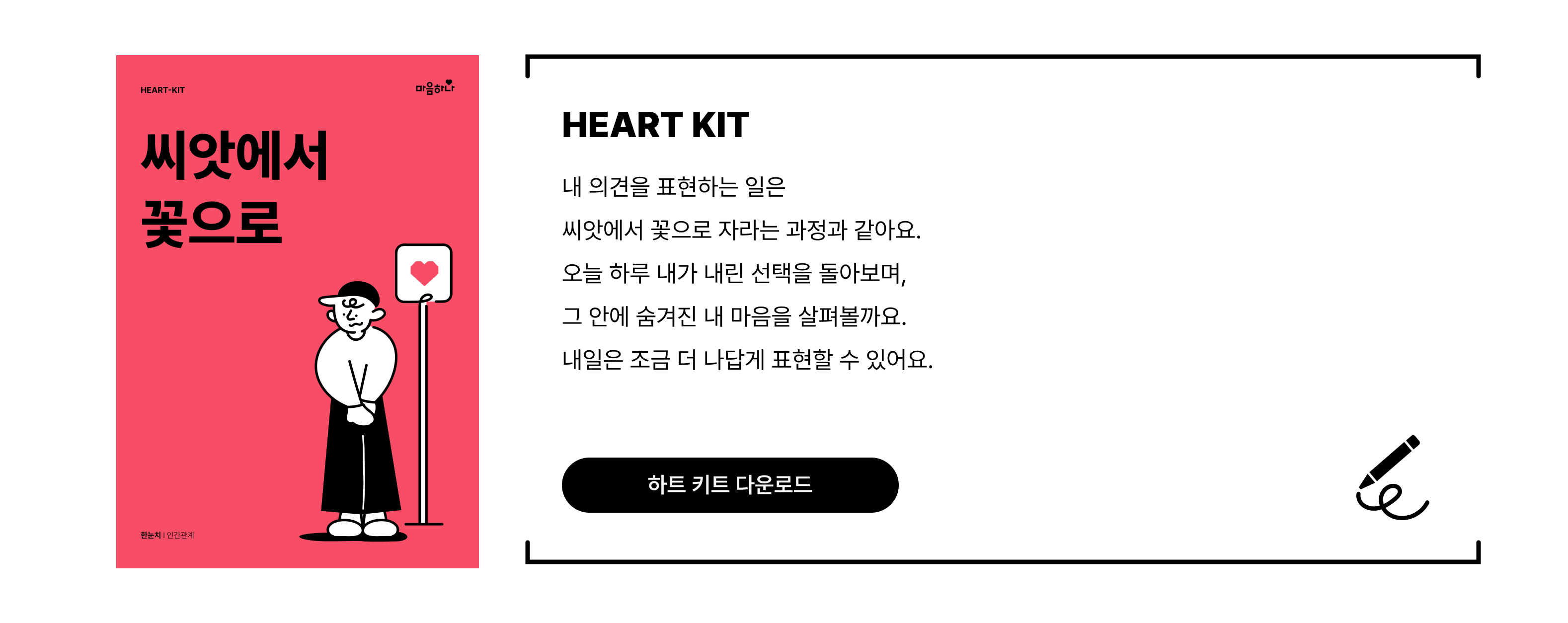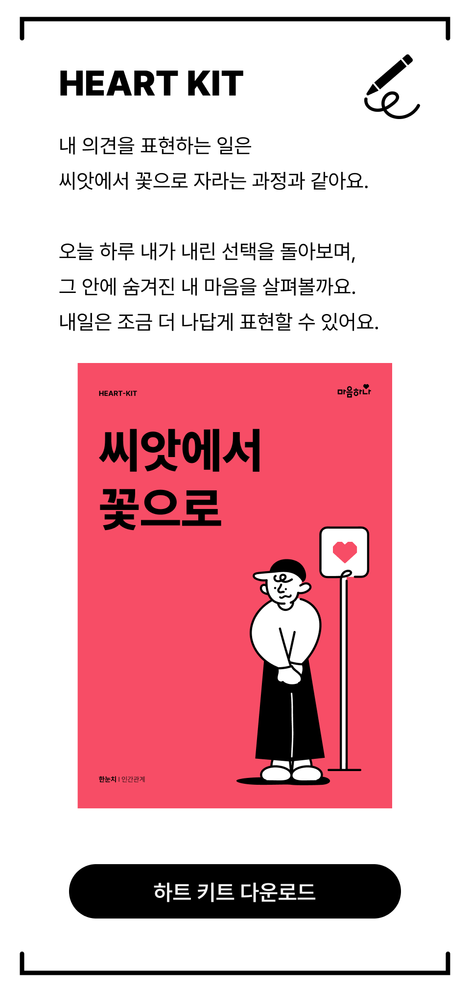 오늘은 <내 의견을 표현하는 법>에 대해 이야기를 나누었어요. 오늘 알려드린 방법처럼 작은 것에서부터 나의 의견을 조금씩 표현하고, 그렇게 표현한 나를 칭찬하다 보면, 다른 사람들에게 끌려다니지 않는 것은 물론 나 자신과 한층 더 가까워질 수 있을 거예요. 오늘 나눈 이야기를 더욱 재밌게 실천해 볼 수 있도록 아래에 ‘하트키트(HEART-KIT)를 준비해 뒀어요. 꼭 다운로드받아서 함께하길 바라요! |