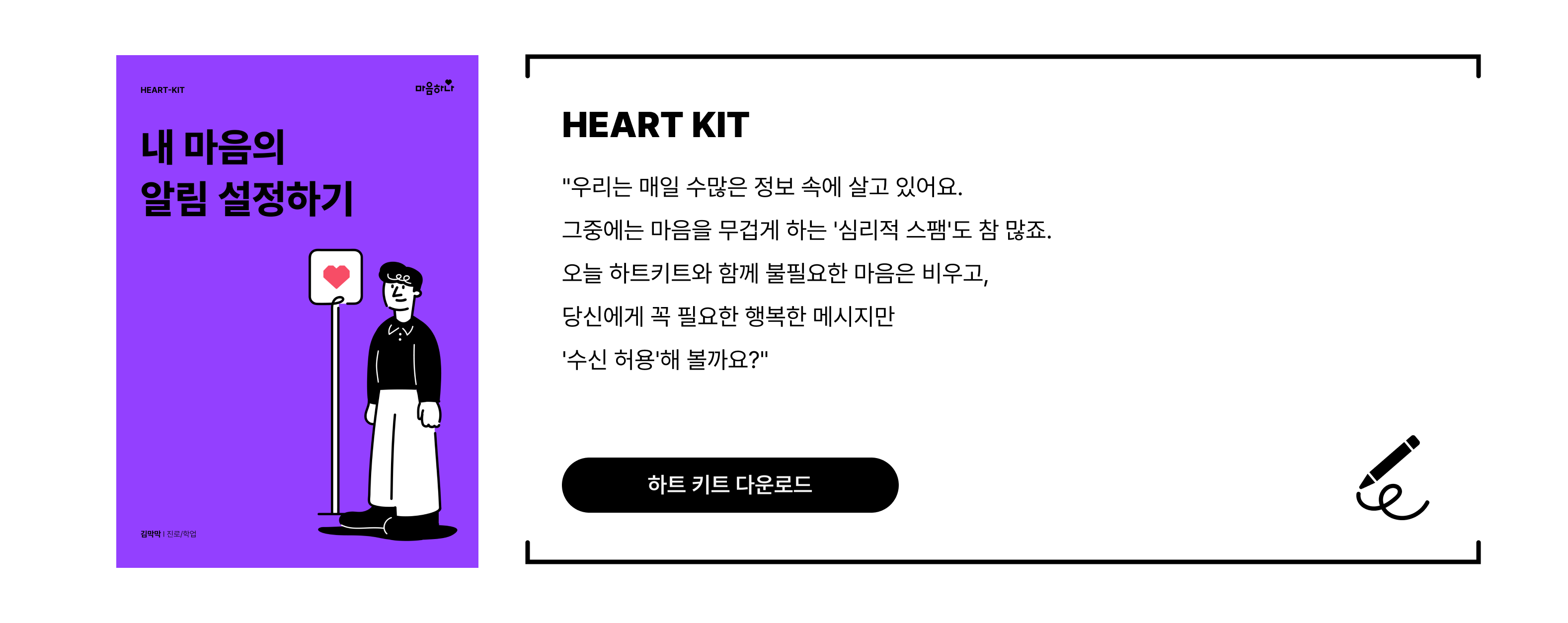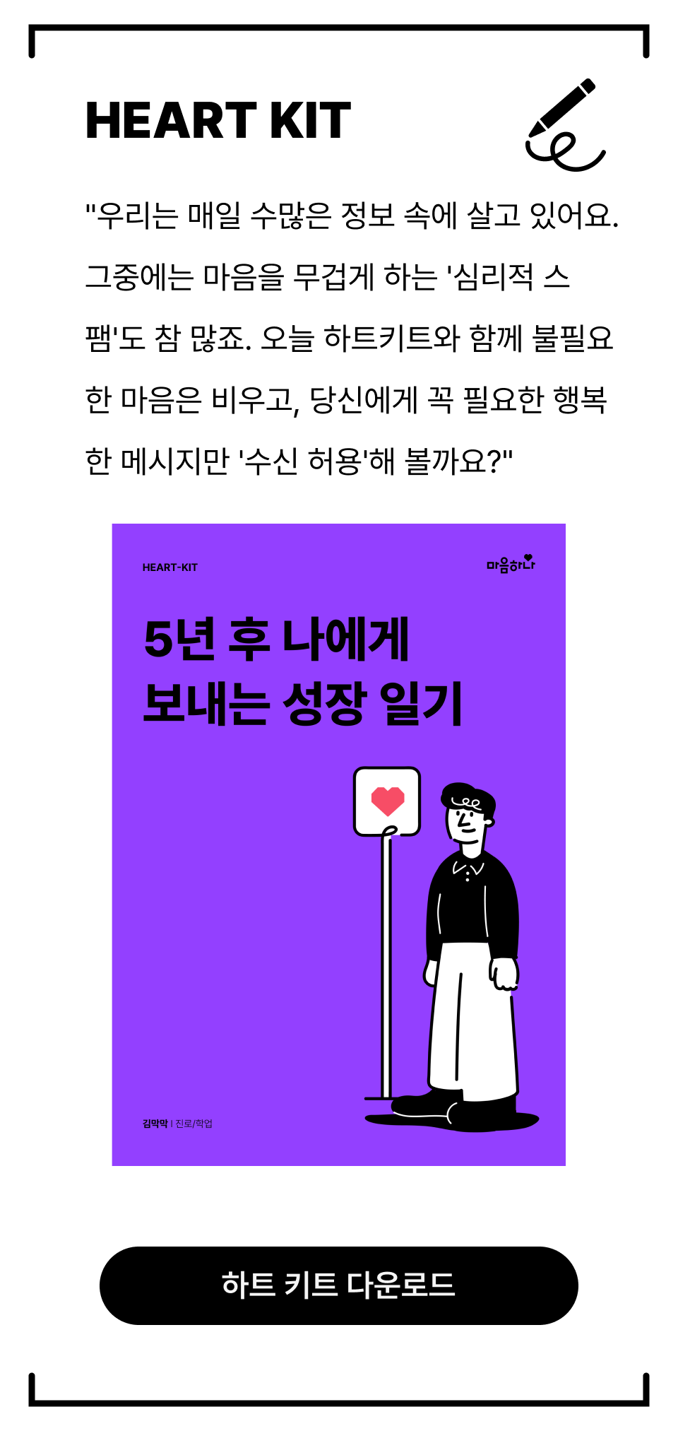 사회의 기준과 타인의 시선을 신경 쓰는 것은 결코 나쁜 일이 아닙니다. 우리는 모두 연결되어 살아가는 사회적 존재니까요. 다만, 그 기준들이 나의 마음을 너무 무겁게 짓누르고 있다면 잠시 내려놓아도 괜찮아요. ‘자기 결정성’은 마치 근육과 같아서 자주 연습할수록 단단해집니다. 처음에는 ‘정말 이렇게 내가 결정해도 괜찮을까?’ 싶어 망설여지겠지만, 아주 작은 일부터 스스로 결정하고 그 결과를 책임지는 연습을 반복해 보세요. 분명 그 경험들이 쌓여 나를 지키는 단단한 근육이 될 거예요.오늘 편지에서 배운 내용을 혼자서도 차근차근 연습할 수 있도록 ‘하트키트(HEART-KIT)’를 준비했어요. 키트를 채워가며 나만의 속도를 찾는 여정을 시작해 보길 응원할게요! |