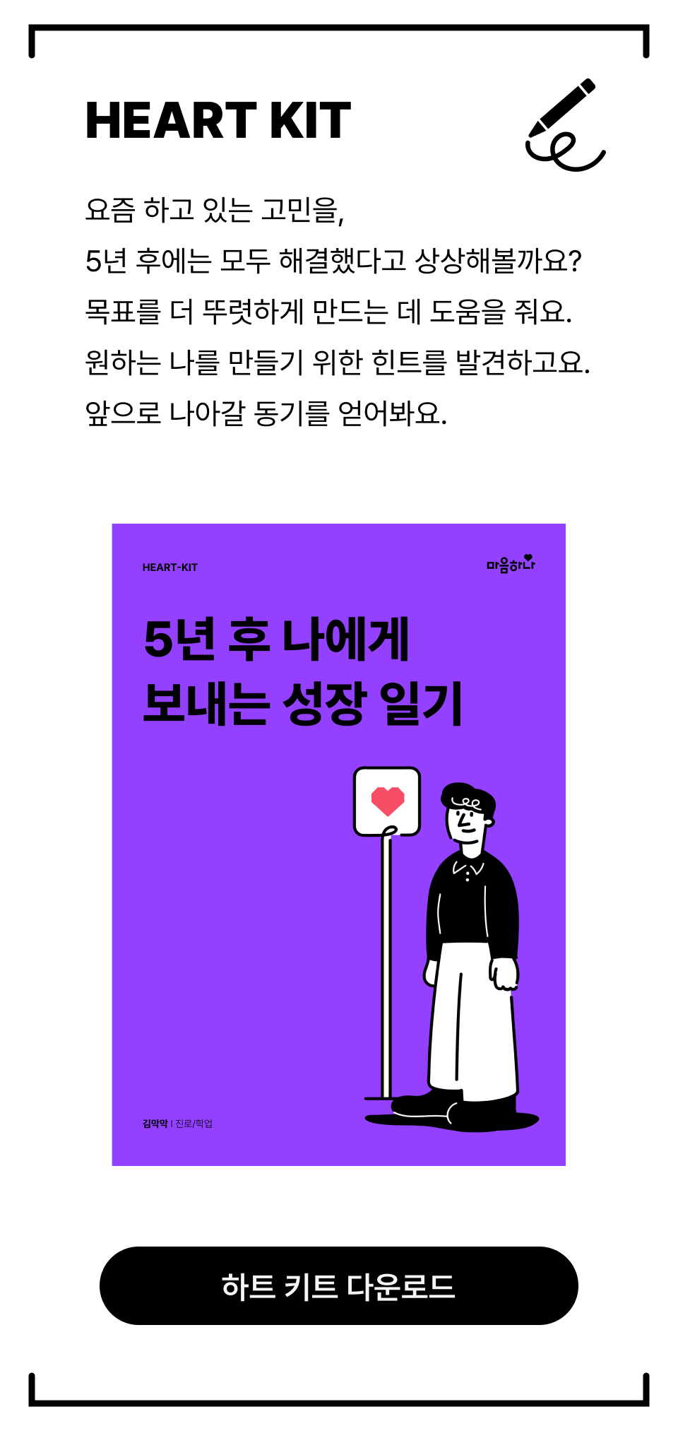 오늘은 <막막함을 해소하는 작은 실천>에 대해 이야기를 나누었어요. 오늘의 핵심은 크게 걱정하지 않고, 고민을 작게 나누어 실천하는 것이에요. 작은 한 걸음부터 시작하면, 막막했던 마음이 조금씩 줄어들고, 내가 걸어가고 싶은 길이 더 뚜렷하게 보이기 시작할 거예요. 오늘 나눈 이야기를 더욱 재밌게 실천해 볼 수 있도록 ‘하트키트(HEART-KIT)를 준비해 뒀어요. 꼭 다운로드받아서 함께하길 바라요! |