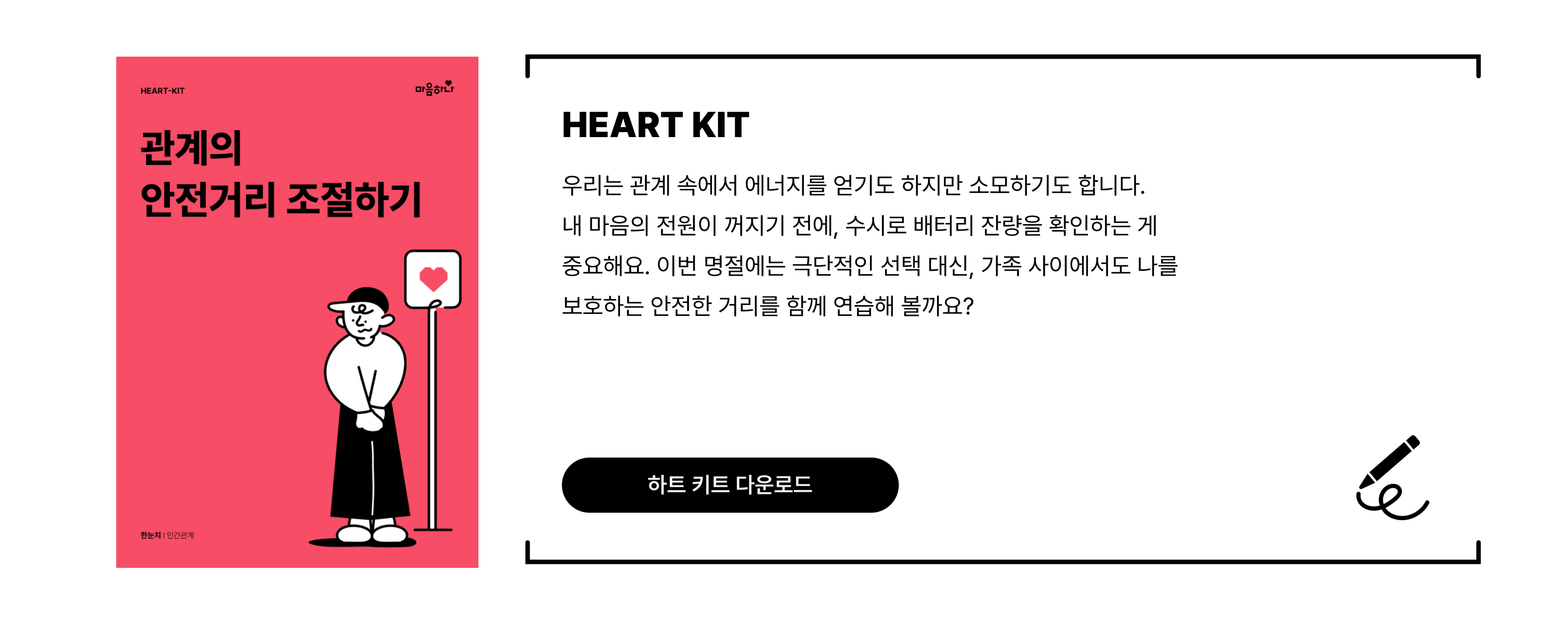 우리는 관계를 통해 에너지를 얻기도 하지만, 때로는 소모하기도 합니다.  이때, 내 마음의 배터리가 바닥나기 전에 수시로 잔량을 확인하는 게 중요해요.  마음의 전원이 꺼진 뒤에는 관계를 되돌리기가 무척 어렵거든요.  그러니 아예 가족들과 등을 돌리기 전에, 잠시 거리를 두고 나를 먼저 돌봐주세요.  내가 편안해져야 관계 속에서도 진정한 만족감을 느낄 수 있습니다. 오늘 배운 내용을 혼자서도 연습할 수 있도록‘하트키트(HEART-KIT)’를 준비했어요.키트를 통해 나를 지키는 연습을 시작할 여러분의 변화를 응원합니다.